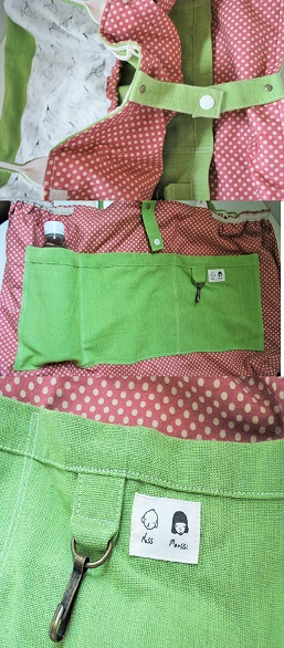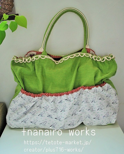グリーンのインド綿に、ことりがずらりと並んだ印象的な生地のポケットを付けた